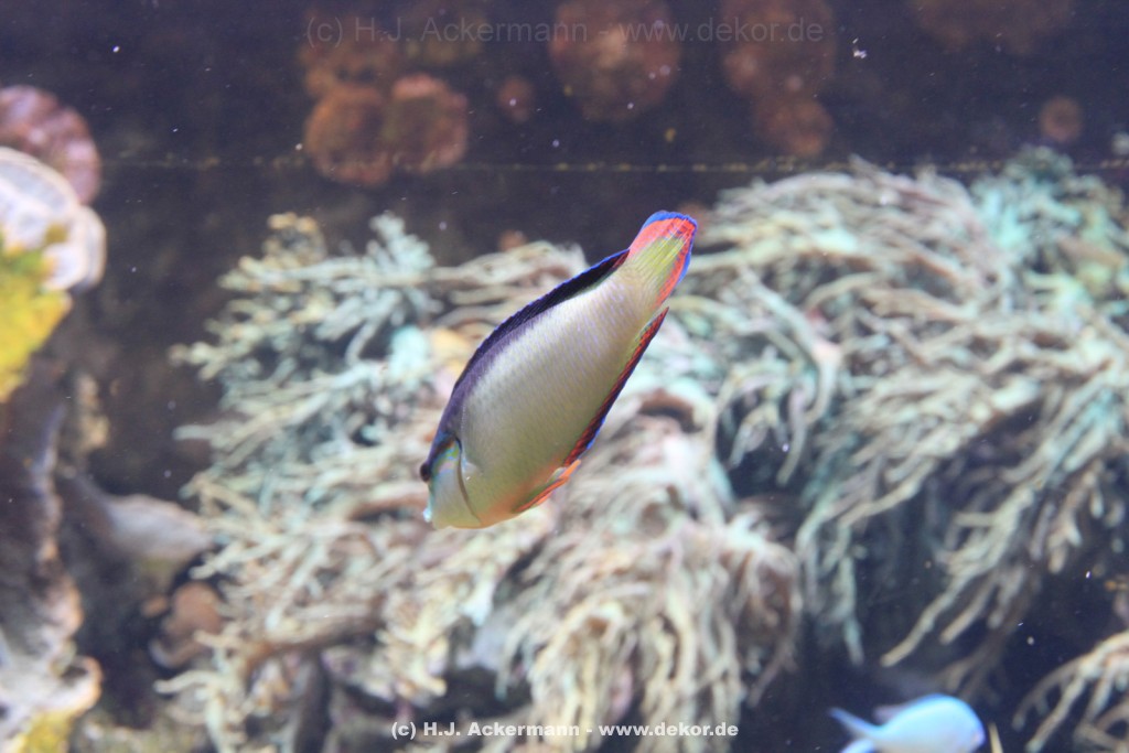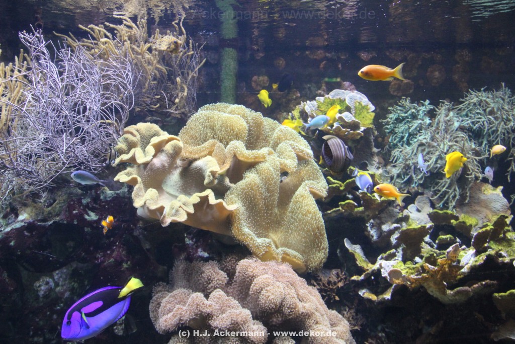 Im Themenraum Korallenriff gibt u.a. ein 17.500 l fassendes Meerwasserbecken mit seinen farbenfrohen Fischen, Korallen und Pflanzen Einblick in die faszinierende Unterwasserwelt dieses einzigartigen Lebensraumes. Weiß- und Schwarzspitzenriffhaie kann man hautnah im Haibecken gegenüber erleben.
